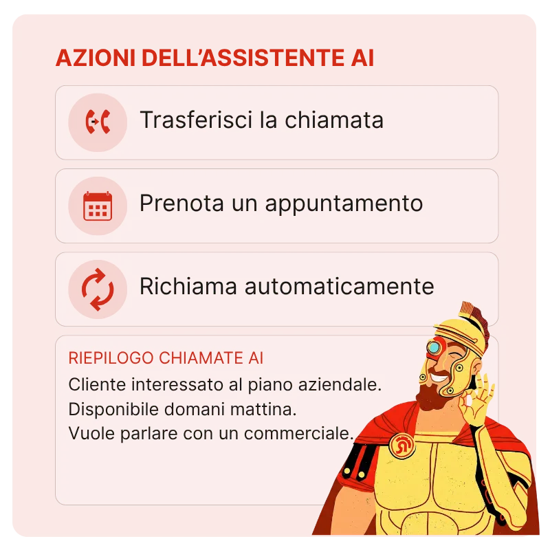 Romulus non è uno dei tanti centralini tradizionali a cui è stata aggiunta l'AI come modulo separato. L'intelligenza artificiale è il cuore del sistema: risponde alle chiamate, prende appuntamenti, raccoglie informazioni, gestisce le richieste di supporto e passa la chiamata all'operatore con il contesto già pronto — tutto nello stesso software.