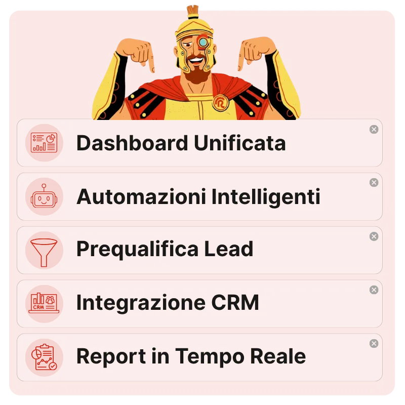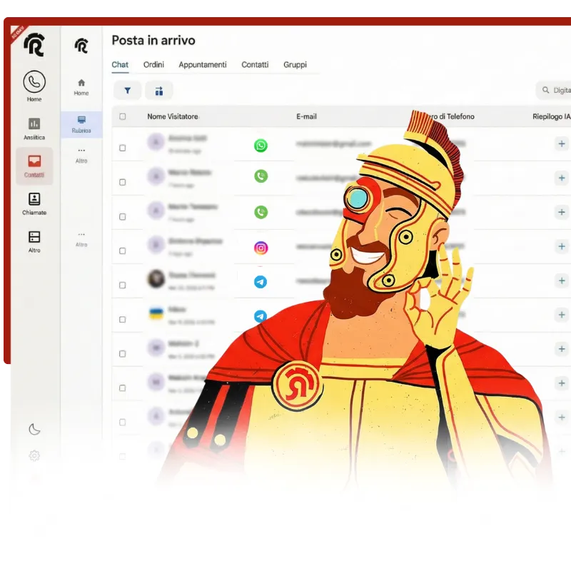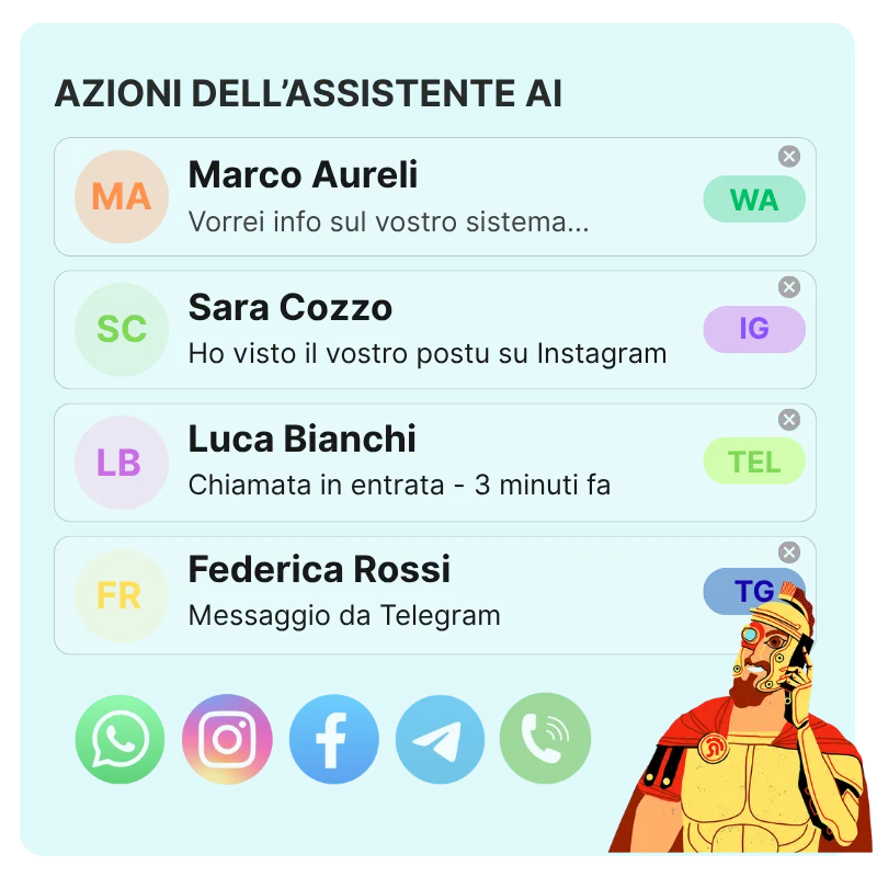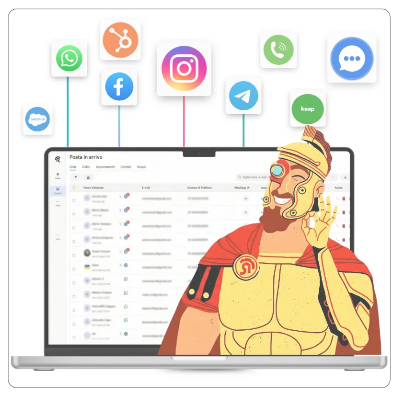 AI, Chiamate, WhatsApp, Instagram, Facebook e Telegram integrati nativamente — un unico sistema che lavora anche quando il tuo team non può.