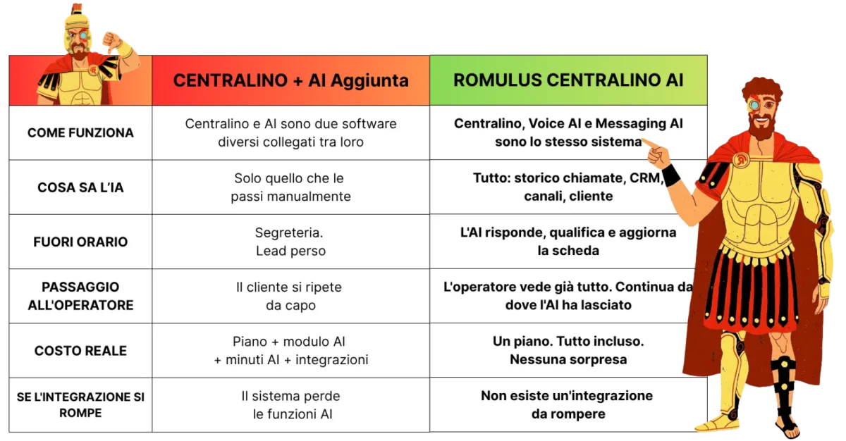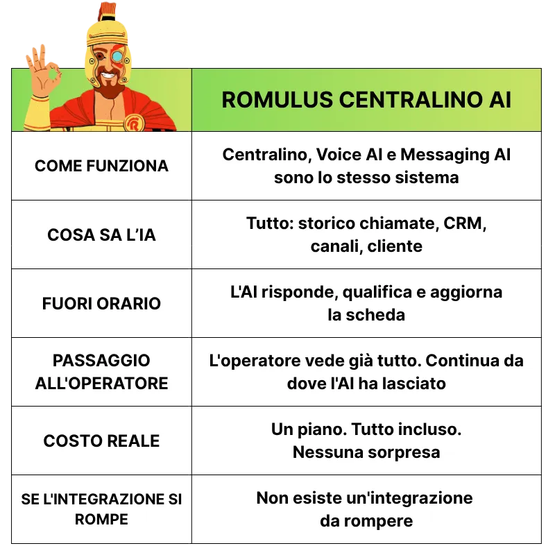 ...Ecco perché abbiamo sviluppato Romulus, il primo centralino AI italiano: per permetterti di centralizzare tutte le comunicazioni, far rispondere l'AI quando il tuo team non può, e ottenere al contempo maggiore efficienza dalle persone che hai già — senza moduli extra, senza costi a consumo, senza integrazioni che si rompono...